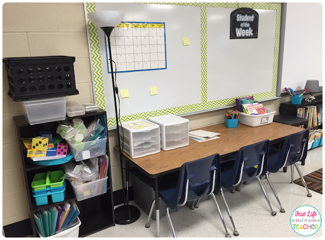 Here’s a little of what my teacher area looks like. Currently, there’s a kidney/horseshoe table sort of “attached” to my desk. It’s the arrangement I’ve used for the last 5 years, and it works beautifully. Not only has it been my go-to arrangement for the past 5 years but it’s worked in 2 schools and 3 different classrooms.