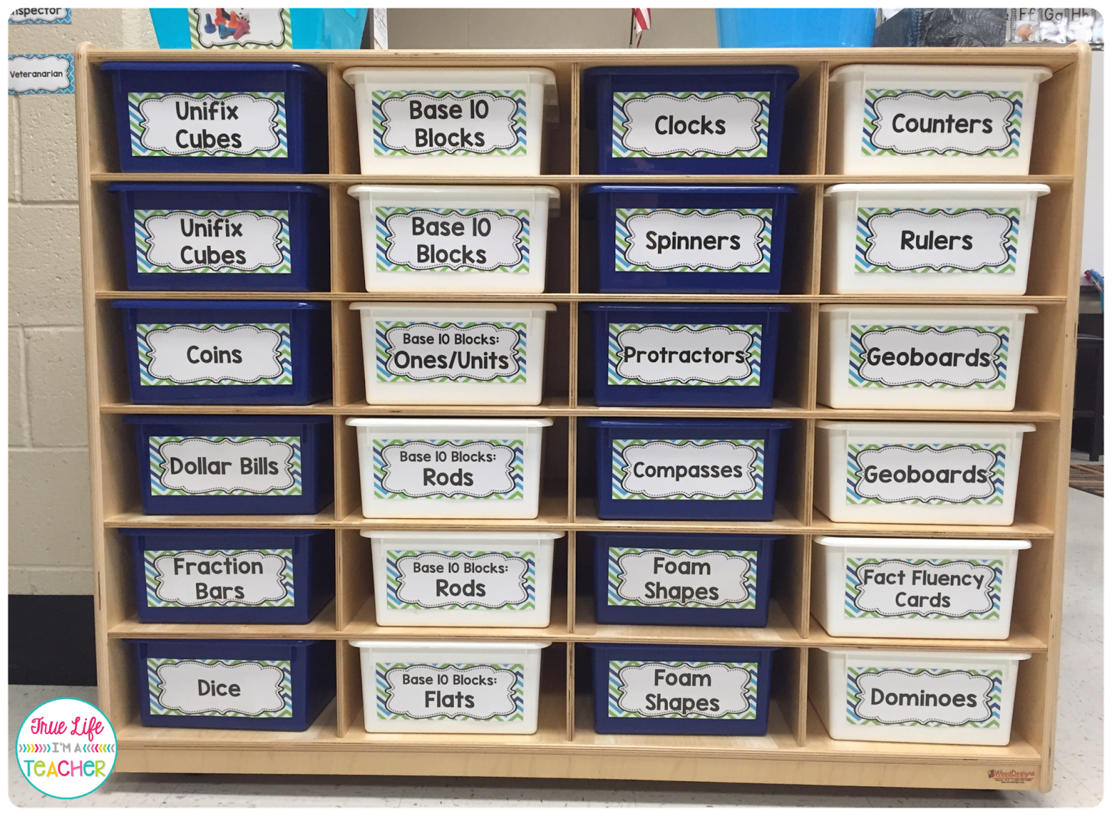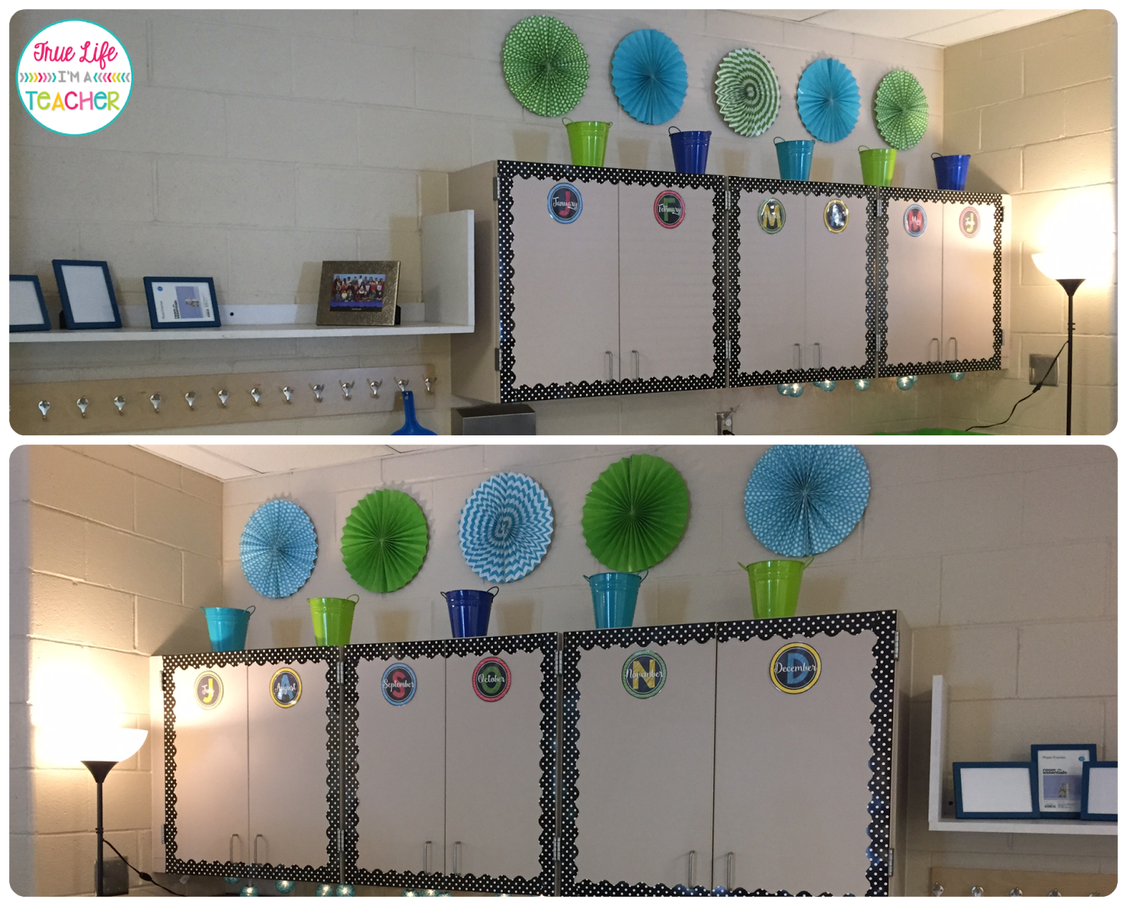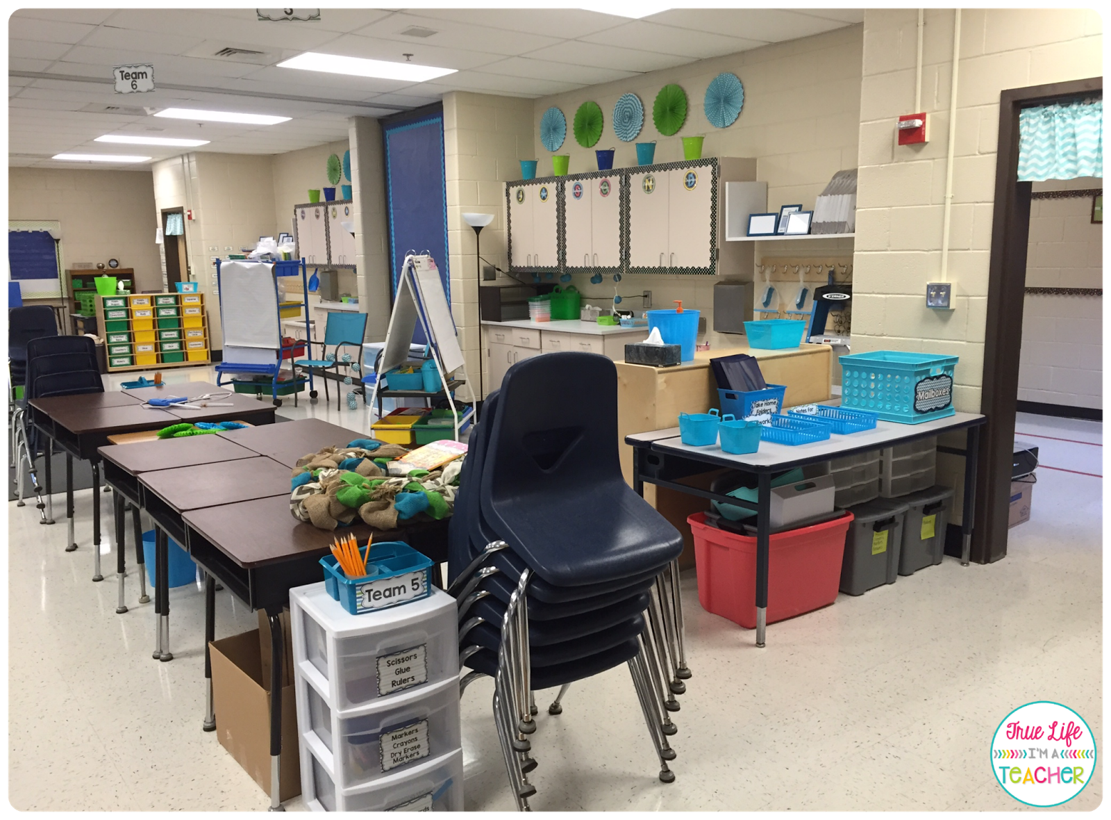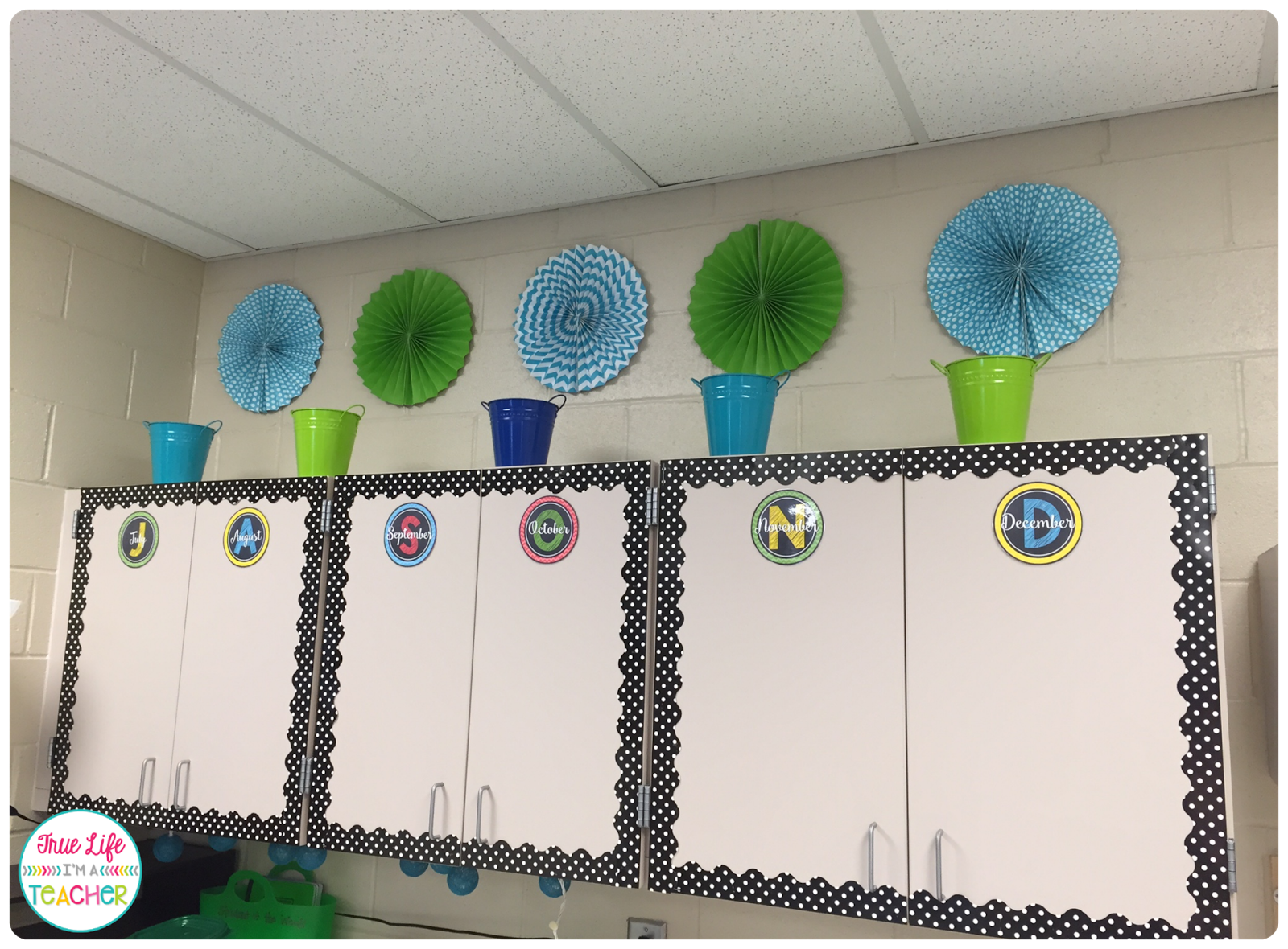 How cute are those colored buckets on top of the cabinets? They were 70% off at Michaels (plus a teacher discount!). They were perfect for our aqua/lime green/navy classroom. I grabbed them and didn’t have a clue how we would use them!