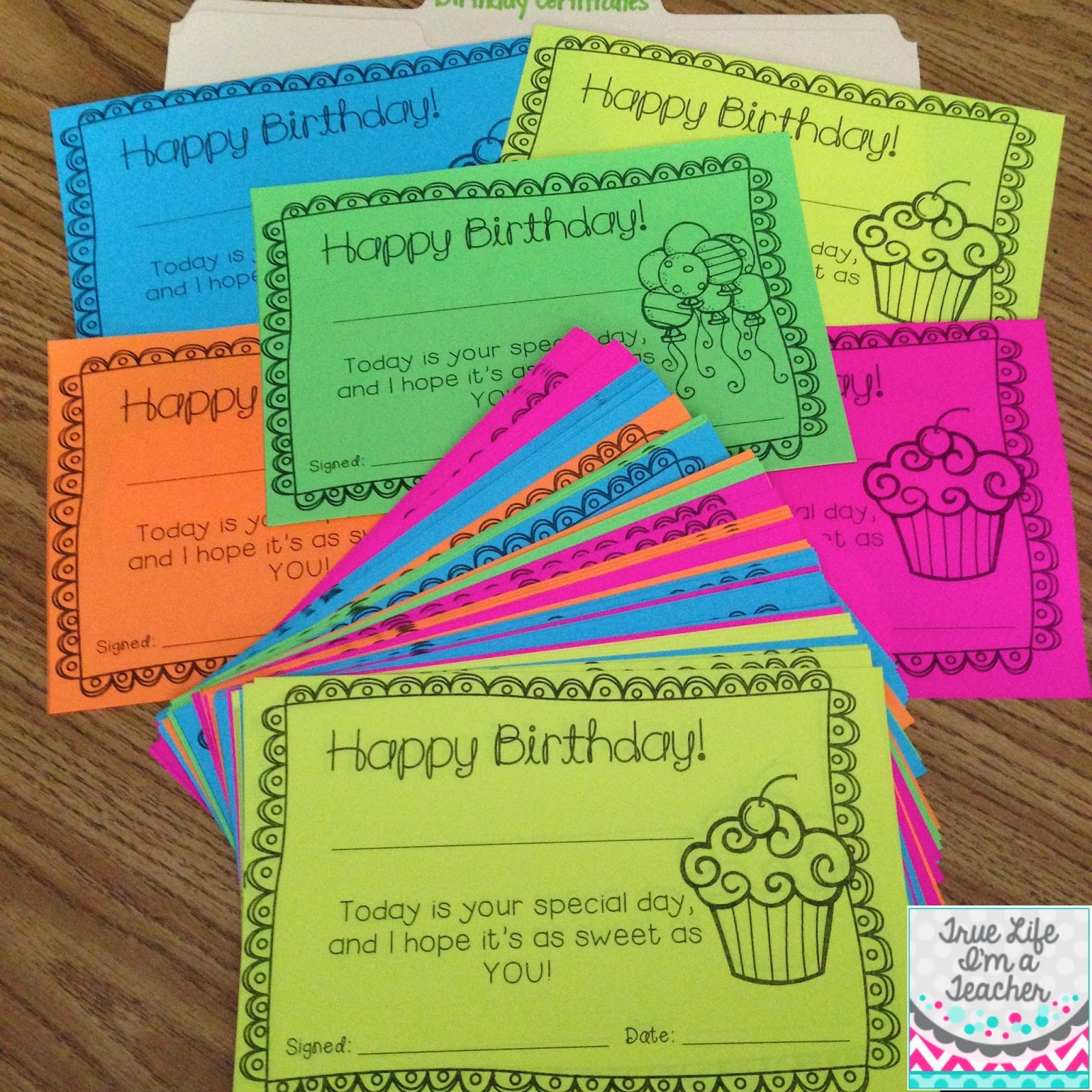 I also made these cute certificates to give to each student. I like to print/copy enough of these before school starts to just write in names and dates, and then keep all birthdays that occur in the same month paper clipped together.