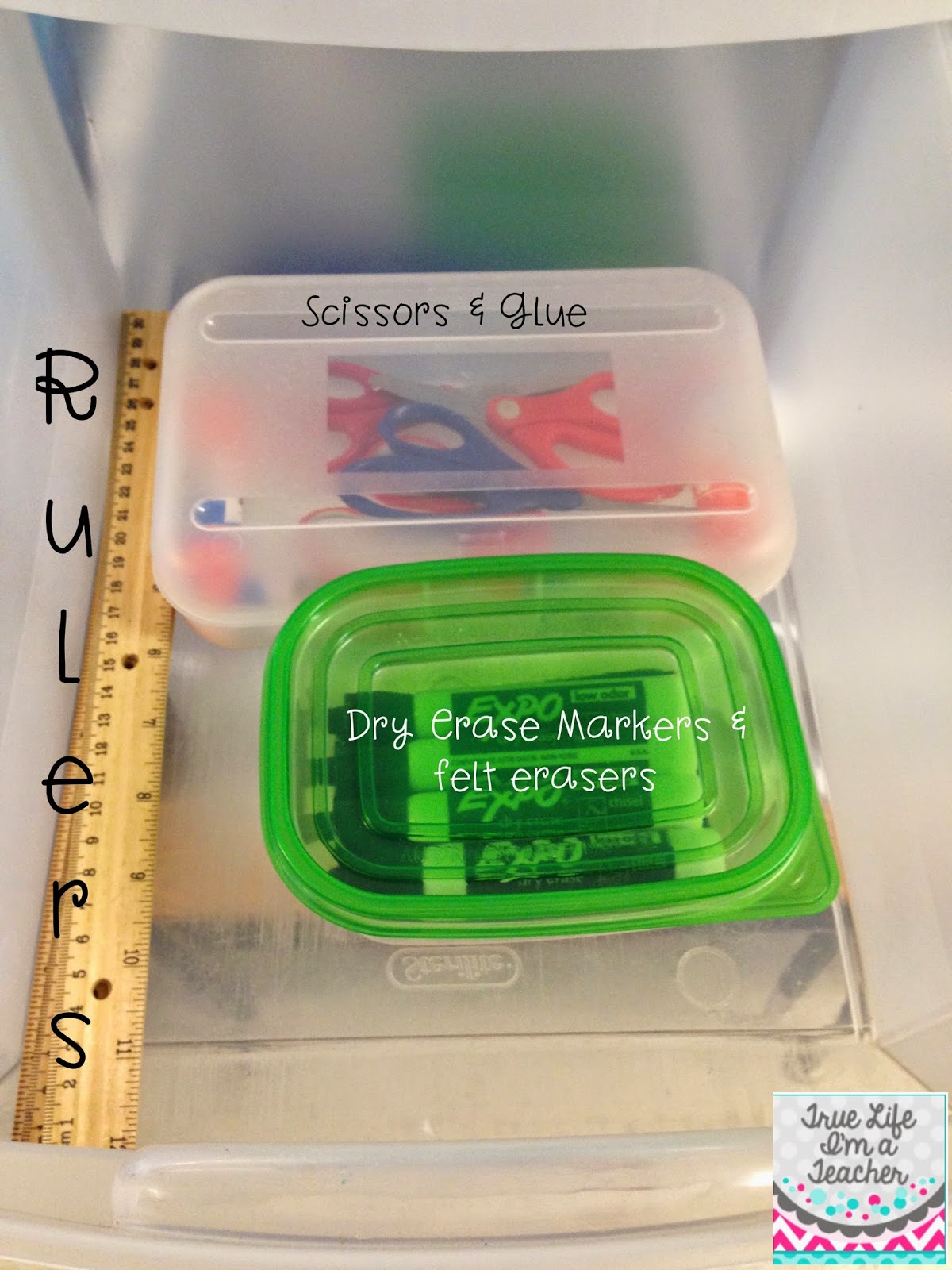 The top drawer houses rulers, scissors, glue sticks, dry erase markers and erasers. I purchased some inexpensive containers from Dollar Tree to keep the items, well, contained. HA! Exactly four of each item are in this drawer, which is enough for each person in the group to have one.