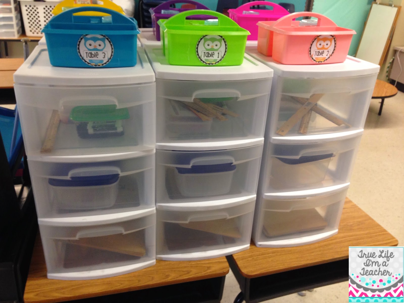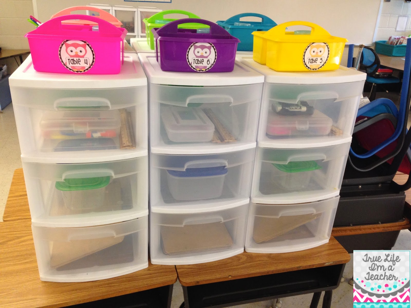 There are 6 teams/groups of desks, and each desk has 3-drawer storage, and a “team tub” that sits on top of the drawers. These sit at the ends of each group of desks. These house pencils, glue, crayons, markers, rulers, clipboards, white boards, dry erase markers/erasers, scissors, and other odds and ends that we might be using regularly during a given season/unit/9 weeks.